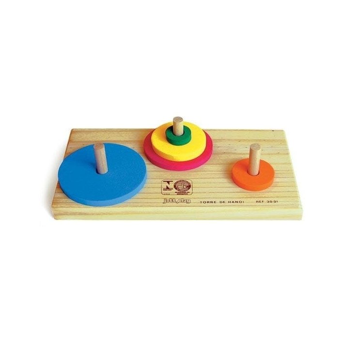 Torre de Hanoi em uma base de madeira com 14x27cm, três pinos nos quais movimentam-se 5 discos em E.V.A coloridos de diâmetros distintos. Acompanha instruçao.CE-BRI/ICEPEX - N 00928-96