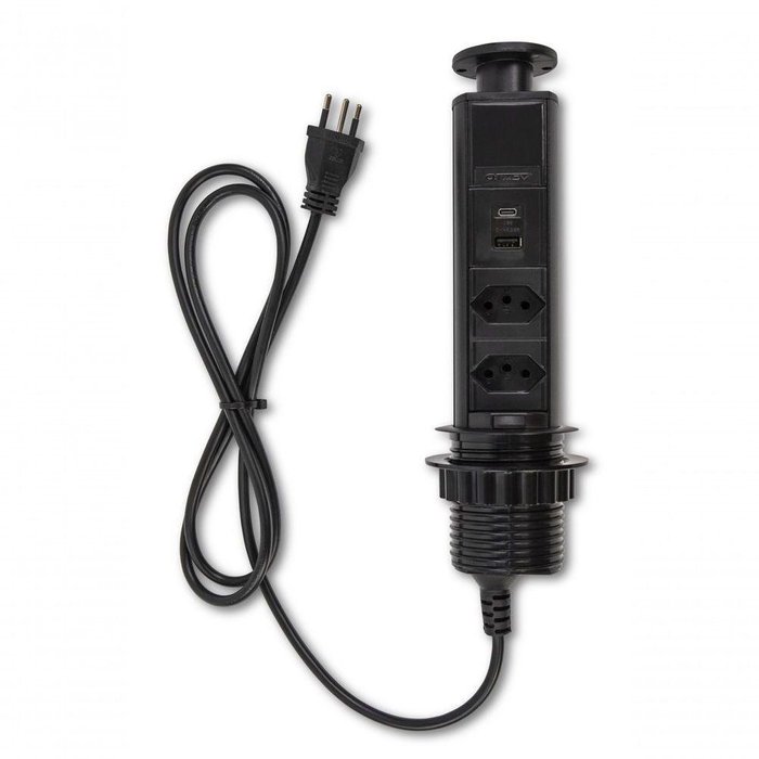 Torre Multiplug Ret. 2 Tom.A Torre de Tomada Multiplug Retrátil para móveis - PRODUTO 100% NACIONAL. Mini Tótem Manual - Faceado com barramento interno Praticidade para teu ambiente, o Mini Totem Manual (torre de tomada) pode ser utilizado em bancadas de cozinhas, home theater e até em estações de trabalho. Uma opção compacta que leva acessibilidade elétrica para onde você precisar. Fácil manuseio, após o basta empurrá-lo para baixo e seu corpo fica totalmente escondido dentro do móvel onde estiver inserido. E com apenas um click em sua tampa é possível puxá-lo para fora novamente. Especificações técnicas: Furo padrão Ø60mm; Voltagem: 127V/250V (bivolt); Potência máxima em 110V: até 2032W Potência máxima em 220V: até 3520W Possui 2 tomadas 20A + 2 USB Carregador Rápido, sendo 1 Tipo A e 1 Tipo C com 3A. 15W. Padrão brasileiro de acordo com NBR 14136; 1,6m de cabo de alimentação. Garantia de 12 meses diretamente com fabricante, empresa líder de mercado com mais de 40 Anos de existência. INSTALAÇÃO 1. Defina a posição da Torre Multiplug no local onde se deseja instalar (mesa, bancada, balcão aéreo, etc). A posição ideal deve prever acesso fácil ao produto e estar próximo a uma tomada para que ela seja conectada à energia. OBS: Certifique-se de que há espaço suficiente para que a Torre se acomode adequadamente, tanto aberta, quanto fechada. Deixe uma folga para o cabo, para permitir o movimento de subida e descida sem limitações. Não posicione a Torre de Tomadas muito próxima a torneiras, nem em locais de difícil acesso. 2. Com o auxílio de uma furadeira serra copo, faça um furo circular de 60mm de diâmetro. A Torre pode ser instalada em uma superfície com até 50mm de espessura. 3. Antes de instalar o produto, separe o anel de travamento da rosca, girando-o no sentido anti-horário. Ele será utilizado posteriormente na instalação para travar a Torre no local desejado. 4. Insira a Torre no furo até o anel cromado da rosca ficar rente à superfície. Rotacione a Torre para a posição desejada para fácil acesso às tomadas. Posicione o anel de travamento na rosca e gire no sentido horário, se assegurando de que a posição está correta. O giro e o encaixe devem ser perfeitos. Caso isso não ocorra, volte, e gire novamente para encaixar. Certifique-se de que o anel de travamento está comprimido contra a superfície e que a Torre está firmemente instalada. 5. Conecte o plugue do cabo de energia a uma tomada. UTILIZAÇÃO 1. Para utilizar a Torre de Tomadas, pressione a parte central do botão de abertura para baixo (sempre apertando no centro, nunca nas laterais). 2. Uma parte da torre será impulsionada para cima. Segure o botão nas laterais e levante a Torre até que as tomadas estejam expostas e o botão de travamento/destravamento faça um clique. 3. Se o Led na parte superior estiver aceso, a energia está ligada e o produto estará preparado para . 4. Após a utilização, remova os plugues das tomadas da Torre. Pressione o botão de travamento/destravamento e empurre o produto para a sua posição . Pressione o botão na parte central para fechar e esconder a torre. Disponível nas seguintes cores: Preto, Cinza, Branco ou Marrom. Produto disponível para retirada em mãos em Porto Alegre - RS - Bairro Santana.