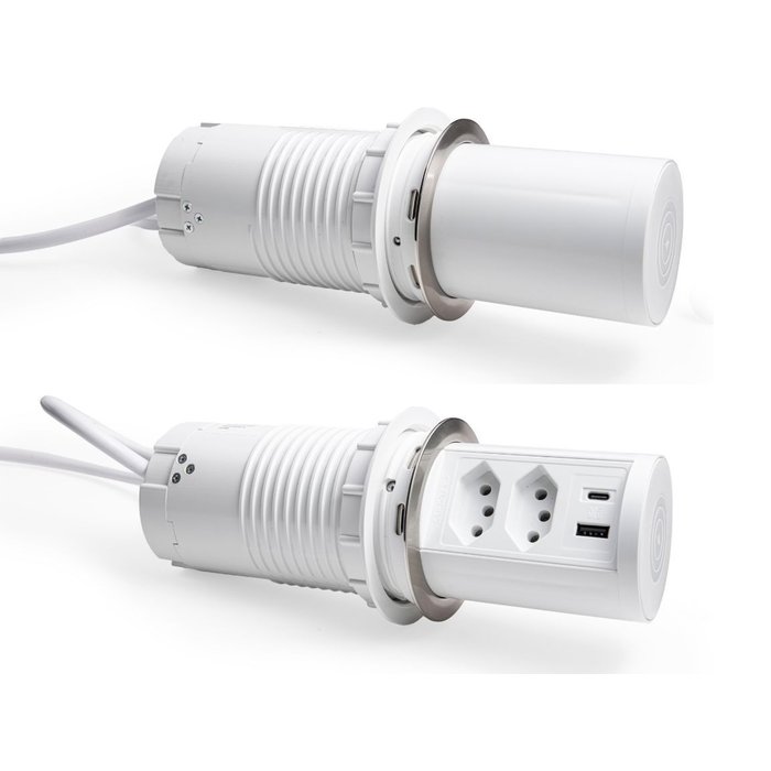 Esta torre de tomada com carregador de indução tem um diferencial bem importante: o seu sistema push open, uma funcionalidade que automatiza a abertura e fechamento da torre. Além disso, por conta da colocação de uma esfera rolante em sua estrutura, a experiência no uso é muito mais suave e agradável.