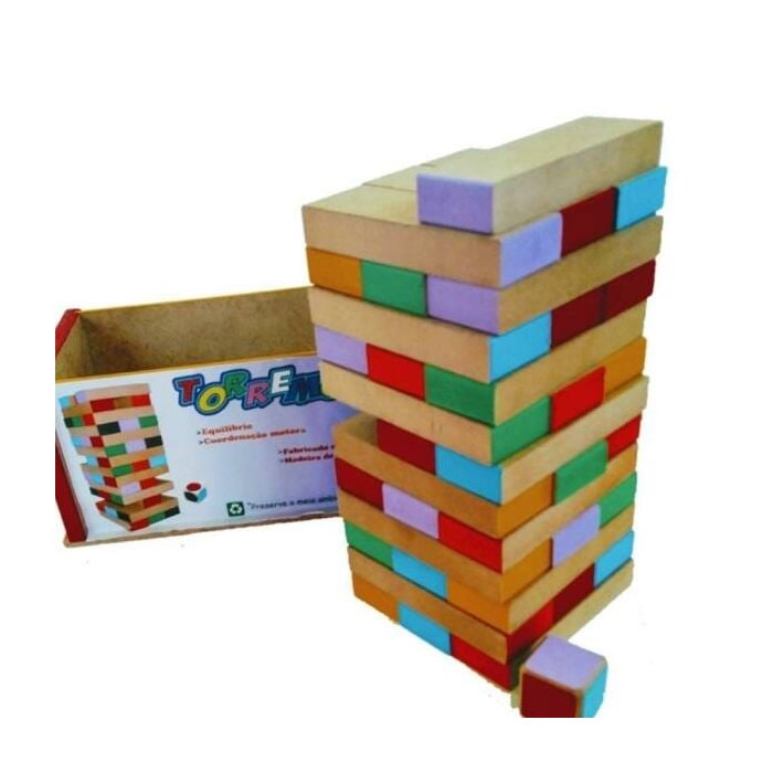 TorremotoBrinquedo educativo de madeiraAcompanha uma caixa de madeira com tampa e 53 peças de madeira coloridas e um dado de madeira.
