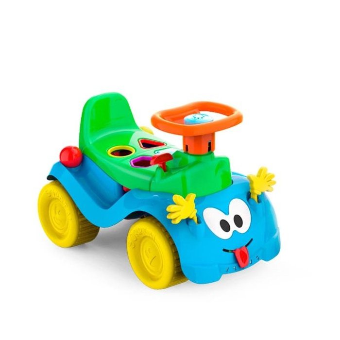 O bebê coloca a bolinha na lateral, ela escorrega, passa por baixo do assento e sai pelo escapamento! É muito legal! Na carinha da Totokinha Bolinha (na frente do brinquedo) as mãozinhas vão para frente e para trás, com um barulhinho de “crec crec”, e a língua também pode ser deslocada para os lados.