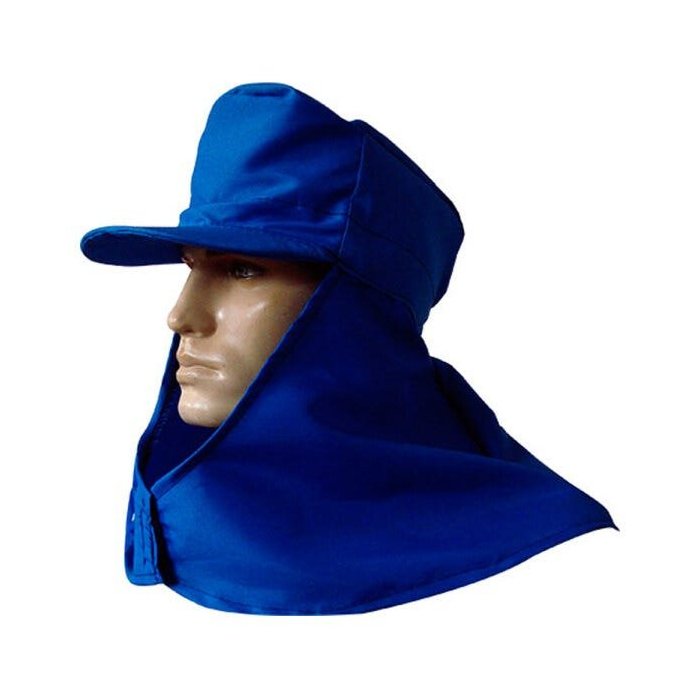 Toucas confeccionadas em brim na cor azul, com proteção para a nuca, com fechamento frontal na altura do pescoço através de velcro.