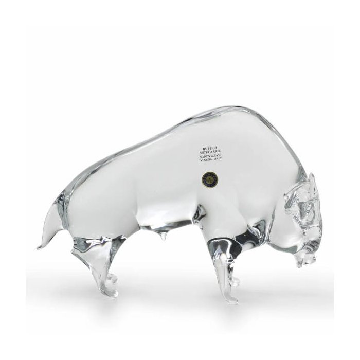 Escultura touro em vidro translúcido. Peça executada em Murano, na Itália de forma totalmente manual e artesanal seguindo antigas tradições dos mestres vidreiros que executavam-nas para demonstrar suas habilidades e perícia no trabalho com o vidro artístico. Na decoração, confere graça ao ambiente como um detalhe singelo ou em ricas coleções. As peças seguem um padrão, porém, devido a sua característica artesanal, cada peça é única.