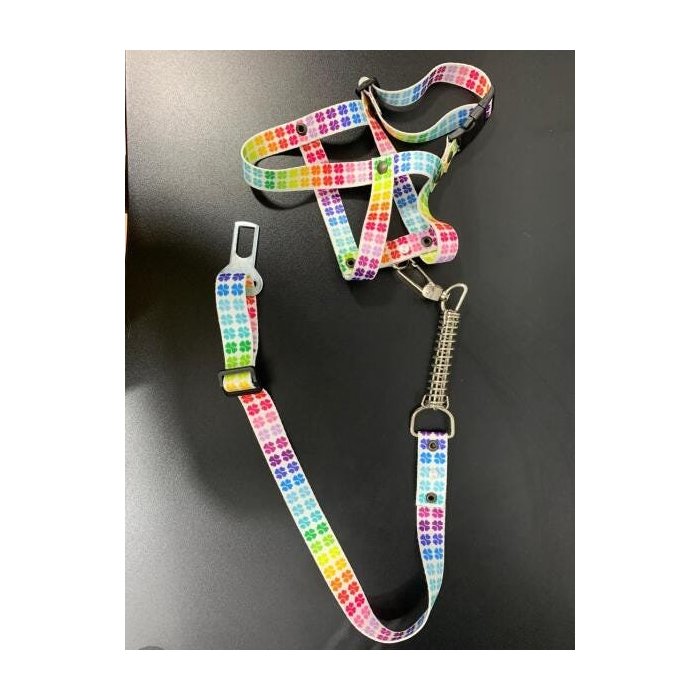 Peitoral e guia em modelo tradicional, com adaptador para cinto de segurança de carros acoplado. Ideal para amigos de pequeno e médio porte, feita em fita acetinada.