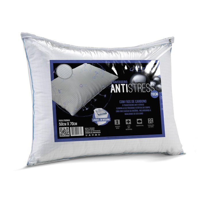 Descrição Travesseiro Altenburg Antistress Branco - 50cm x 70cm A Coleção O Travesseiro Antistress possui fios de carbono na estrutura do tecido que agem na condução da energia eletrostática do corpo, acumulada durante o dia, principalmente, na região da cabeça, pescoço e ombros; uma das causas da insônia. O princípio antiestático do fio de carbono conduz a energia eletrostática do tecido ao ar, neutralizando a energia conduzida ao travesseiro. Com suporte médio, indicado para quem dorme de costas, garante uma qualidade de sono restauradora e relaxante. Características Conteúdo: 1 Travesseiro Antistress Tamanho: Padrão Dimensões: 50cm x 70cm Suporte: Médio Enchimento: 100% fibra de poliéster Tecido: 100% poliéster Posição de dormir: para quem dorme de costas CARACTERÍSTICAS EXTRAS: Elimina a eletricidade estática do corpo Ação antimicrobiana Tecnologia de ponta