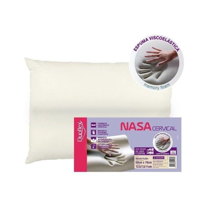 Travesseiro NASA Viscoelástico Cervical DuoflexNASA é uma espuma viscoelástica de última geração, moldada com alta viscosidade e densidade, recomendada por ortopedistas e fisioterapeutas e comercializado em mais de 40 países no mundo. Um travesseiro automoldável e termossensível, que se adapta ao contorno e temperatura do corpo, exercendo menos pressão nas áreas mais quentes ou salientes, facilitando assim, a circulação sanguínea.O Travesseiro Nasa Cervical Duoflex é ideal para a posição natural de descanso em formato anatômico cervical, oferendo maior capacidade de absorção do peso e distribuição equalizada da pressão sobre o corpo, agindo como um verdadeiro amortecedor.Características:- Tamanho para fronha 50x70 cm- Espuma Viscoelástico NASA .- Capa com Zíper em Malha Plush, 85% Algodão e 15% Poliéster- Medidas Semiperimetrais: 48 cm x 68 cm x 12 cm* Embalado a vácuo, enrolado dentro da caixa.