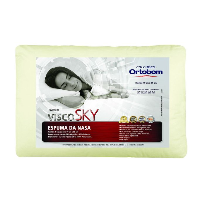 Travesseiro Ortobom Visco Sky 40cm x 60cm. Travesseiro produzido com espuma Viscoelástica 100% poliuretano, capa com 57% algodão e 43% poliéster. Produto nobre e de alta qualidade, caracterizado pela maior capacidade de absorção de peso e por se moldar aos contornos exatos do corpo. Experimente e tenha a certeza de que suas noites serão tranquilas e bem aproveitadas. Uma ótima opção para quem leva em conta a importância dos cuidados com o corpo na hora de dormir.- Marca: Ortobom- Modelo: Travesseiro Visco Sky;- Largura: 60cm;- Altura: 14cm;- Comprimento: 40cm;- Para Fronha: 40x60cm;- Revestimento: Tecido 57% Algodão e 43% Poliéster;- Enchimento: Espuma Viscoelástica 100% Poliuretano;- Antialérgico e Antiácaro- Alivia dores e pressões;- Maior capacidade de absorção de peso;- Molda-se aos contornos exatos do corpo;- Não absorve o calor do corpo;- cor: Bege;- Use capas protetoras- Troque as fronhas, duas vezes na semana.- Recomendamos que o travesseiro seja lavado á mão em 3 em 3 meses.- Segue as dicas de como lavar: Encharque o travesseiro em um tanque ou balde que o comporte; Esfregue bem com detergente neutro ou sabão líquido de sua preferência; Enxague totalmente; Aperte e não torça para retirar o excesso de água; Não exponha seu travesseiro ao sol, deixe que seque naturalmente. é importante deixar que o travesseiro seque 100%, então aconselhamos que deixe o travesseiro secar entre dois á três dias.