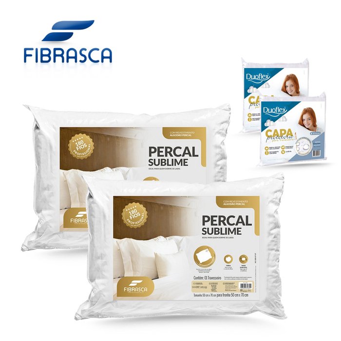 Travesseiro Percal Sublime Fibrasca 2 Unid. Capa Protetora 2 Unid. Super como feito pra você! Com o enchimento em fibra e capa em percal 180 fios tipo hotelaria,o travesseiro Percal Sublime Fibrasca é o produto ideal paraquem busca maciez e suavidade na hora do descanso. Lavável Em MaquinaRevitaliza O Volume Ao LavarNão Parte O Enchimento E Não Embola Marca: FibrascaCapa: 65% Algodão 35% Poliester Enchimento: 100% Fibra de PoliesterLargura: 38 cm Comprimento: 55 cmAltura: 17 cm Suporte: Alto CAPA PROTETORAResistente a líquidos e confeccionada em tecido percal 200 fios 100% algodão, a capa deve ser utilizada diariamente para proteger o travesseiro de todo suor e demaissecreções que eliminamos durante o sono, a fim de prolongar a sua vida útil. Essa linha também oferece uma capa protetora 100% algodão para o travesseiro Alpino de Corpo. 2 Travesseiros2 Capas Protetoras