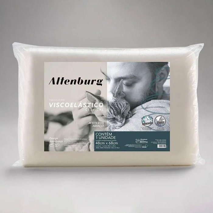 Travesseiro Viscoelástico Cervical Altenburg Travesseiro Altenburg Viscoelástico Cervical Terapêutico 48cm x 68cm Está sofrendo com dores no pescoço ao acordar? O Travesseiro Viscoelástico Cervical Terapêutico da Altenburg é ideal para você! Desenvolvido para proporcionar suporte cervical perfeito, ele ajuda a corrigir a postura, aliviando tensões e proporcionando um sono reparador. Especificações Técnicas:Tamanho: 48cm x 68cm Material: Viscoelástico (poliuretano) Design terapêutico ergonômico Molda-se ao formato da cabeça e pescoço Ideal para aliviar dores cervicais Antiácaro e hipoalergênico