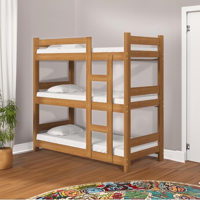 Apresentamos nossa Treliche, uma solução versátil e funcional para otimizar o espaço em ambientes compartilhados ou compactos. Com sua dupla furação, ela oferece a flexibilidade de utilizar colchões de 78 cm ou 88 cm de largura, adaptando-se perfeitamente às necessidades dos usuários. Produzida em madeira maciça pinus com acabamento semi brilho, nossa treliche combina resistência, durabilidade e elegância em um só produto. Suas três camas individuais proporcionam conforto para acomodar até três pessoas, suportando até 120 kg por cama. Ideal para famílias, quartos infantis ou espaços de uso compartilhado, nossa treliche é a escolha perfeita para quem busca praticidade, conforto e estilo. E para proporcionar o máximo de conforto desde o primeiro momento, acompanha três colchões solteiro da renomada marca Ortobom, com espuma D20, garantindo uma experiência de sono revitalizante e reparadora. Produzido em Madeira Maciça: Material de qualidade que confere resistência e durabilidade ao produto, garantindo sua longevidade e robustez. Perfeita para Acomodar Pessoas Confortavelmente sem Ocupar Muito Espaço: Ideal para ambientes compactos ou compartilhados, oferecendo a possibilidade de acomodar confortavelmente mais de uma pessoa sem comprometer a área disponível. Acabamento Semi Brilho: Acabamento estético que confere um toque de elegância e sofisticação à treliche, tornando-a uma peça atrativa para qualquer ambiente. Suporta até 120 Kg por Cama: Oferece segurança e estabilidade durante o uso, garantindo conforto para os usuários e possibilitando que cada cama suporte até 120 kg de peso. Dupla Furação: Opção versátil que permite utilizar colchões de 78 cm ou 88 cm de largura, adaptando-se às necessidades do usuário. Inclui 3 Colchões Ortobom: Acompanha três colchões solteiro da renomada marca Ortobom, com espuma D20, garantindo conforto e suporte adequados para um sono revitalizante e reparador.Dimensões da treliche: Largura 95 cm; Profundidade 199 cm; Altura 193 cm. Dimensões dos colchões: Largura 88 cm; Profundidade 188 cm; Altura 12 cm. Itens inclusos: 1 treliche e 3 colchões solteiro Ortobom Complexidade da montagem: Média, pode ser montado por apenas uma pessoa e/ou necessite de maior conhecimento para montagem. Recomendações de uso, manutenção e limpeza: Limpar com flanela ou pano macio seco, não utilizar produtos abrasivos, desengordurantes, álcool ou solvente. Não expor o produto diretamente a luz solar e à umidade Garantia : 3 meses OBS: Foto meramente ilustrativa, obejtos, colchão e decoração não fazem parte do produto.