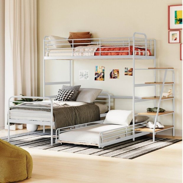 A cama superior é acessada por uma escada lateral multifuncional, que também funciona como estante, otimizando o ambiente com personalidade. Na parte inferior, o conjunto inclui uma cama padrão com cabeceiras arredondadas e uma cama auxiliar com rodízios de plástico que garante mobilidade suave e prática para acomodar até três pessoas com conforto.