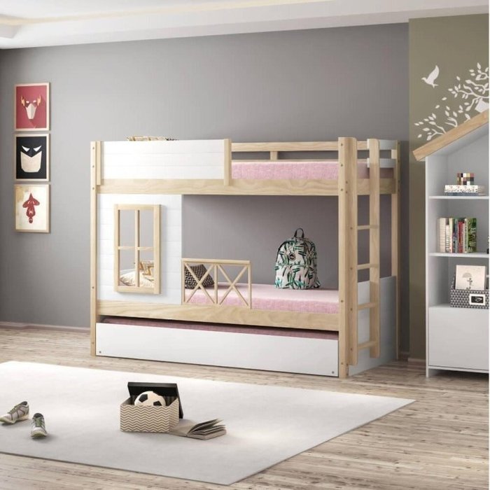 A cama superior conta com um painel fechado, sendo uma grade de proteção e uma escada de fácil acesso com 4 degraus na lateral. A cama da parte debaixo, na lateral frontal há 1 janela e 1 grade de proteção em forma de X, proporcionando brincadeiras saudáveis e noites seguras. E sob toda essa incrível estrutura, fica a cama auxiliar com 2 rodinhas de fácil manuseio.