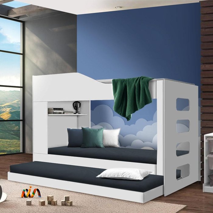 Este treliche oferece praticidade e funcionalidade com destaque. Feito completamente de MDF, possui prateleira para objetos e cama auxiliar com rodízios. Sua escada resistente facilita o acesso à cama superior. Ideal para colchão padrão solteiro (88 x 188 cm), porém os colchões não estão inclusos. Ideal para otimizar o espaço com estilo.- Produto 100% MDF- Prateleira para objetos- Cama auxiliar com rodízios- Escada resistente- Ideal para colchão tamanho padrão solteiro (88 x 188 cm)- Não acompanha colchõesDimensões do produto: Largura 97,5 cm; Profundidade 193 cm; Altura 155 cm.Itens Inclusos: 1 beliche com cama auxiliar (não acompanha colchão)Complexidade da montagem: Média, pode ser montado por mais de uma pessoa e/ou necessite de maior conhecimento para montagem.Recomendações de uso, manutenção e limpeza: Limpar com flanela ou pano macio seco, não utilizar produtos abrasivos, desengordurantes, álcool ou solvente. Não expor o produto diretamente a luz solar e à umidadeGarantia: 3 mesesOBS: Foto meramente ilustrativa, objetos, utensílios e decoração não fazem parte do produto. Manual de Montagem e Instalação da Cama.Manual de Montagem e Instalação da Cama Auxiliar.