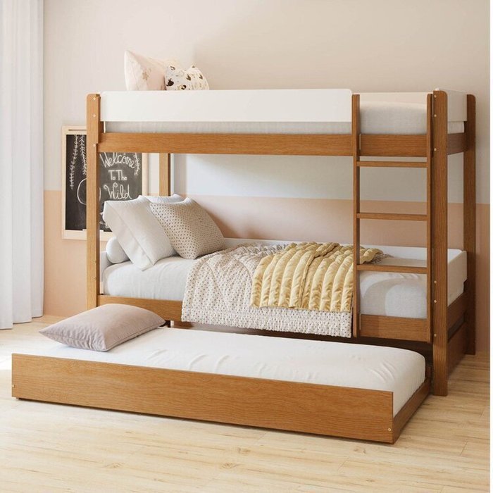 Transforme o quarto infantil em um palco de aventuras triplas e sonhos em família com este conjunto especial da Linha Aria. O Beliche com Cama Auxiliar é a solução definitiva para quem precisa de três camas em um único espaço, unindo otimização e magia. Sua estrutura é robusta, feita 100% em madeira maciça de pinus e acabamento em verniz fosco nogueira com detalhes em MDF laqueado branco, garantindo a solidez e a segurança prioritária para que os pais durmam tranquilos.