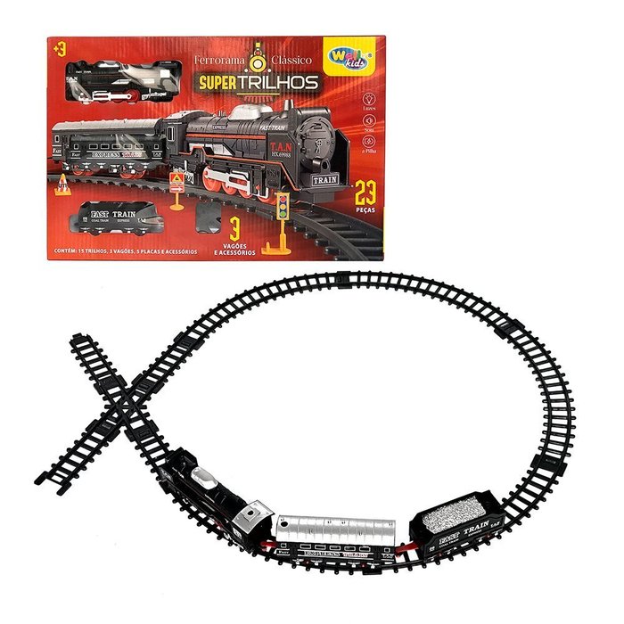 Para os amantes de locomotivas, esse brinquedo vai levar a diversão a um novo nível. Com um design clássico, o trem foi feita com diversos detalhes em um sua construção, além dos seus acessórios, para trazer ainda mais imersão na hora da brincadeira. Além de contar com um trem que acende o farol dianteiro, conta também com trilhos fáceis de montar e com diversos tipos de combinações para fazer o caminho que quiser, podendo monta-lo em forma circular, reto com curvas, em loop, entre outros tipos, é a escolha perfeita para crianças pequenas e também para os admiradores mais experientes, além disso, conta com um vagão de passageiros, de carga que são removíveis e acessórios como sinaleiro, placa e cone, garantindo mais imersão e diversão ao ambiente. Seu trilhos são em forma circular, possibilitando que o trem ande em voltas pelo tempo que você quiser. Sendo à base de pilhas, é de fácil ativação, bastando apenas abrir sua parte de cima e inserir 2 pilhas AA e posicionar o trem nos trilhos. Feito com materiais de qualidade, o trem garante durabilidade e resistência, podendo brincar por horas sem se preocupar com a integridade do brinquedo. -Necessário o uso de 02 Pilhas AA (Não inclusas);-15 Trilhos;-3 Vagões;-5 Placas e acessórios.