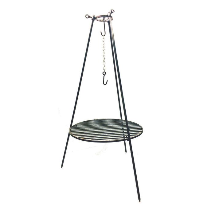 Para você ter o prazer de fazer o seu churrasco no modo campeiro no fogo de chão a trempe é um acessório muito prático, esquente água em chaleiras e defume peças de carne. Possui um ganho com corrente onde é possível pendurar o que for necessário.