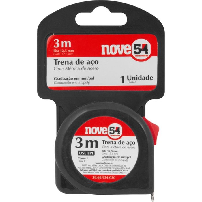 Ref. Fornecedor:3868954030 Marca:Nove54Conteúdo da embalagem:1 TrenaDestaques e diferenciais:Fita em aço com pintura brilhante, graduação em milímetros e polegadas, além de numeração contínua, facilitando a leitura e proporcionando maior precisão. Possui botão trava da fita que facilita a leitura e presilha para cinto, auxiliando no transporte e segurança durante o uso. Conta ainda com gancho ajustável na ponta da fita, permitindo medições internas e externas mais precisas.Aplicações e dicas de uso:Indicada para medições em geral Características Técnicas:Comprimento da trena: 3 m Largura da fita da trena: 12,5 mm Revestimento da fita da trena: Pintado Acabamento da fita da trena: Brilhante Graduação da trena: mm/pol Material da caixa da trena: ABS de alta resistência Sistema de trava da trena: Botão
