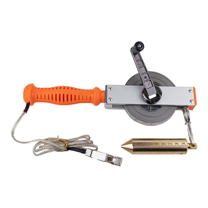 Trena de Profundidade para Tanque Fita em Aço Inoxidável 50m Prumo Latão Graduado e Cabo de Aterrame