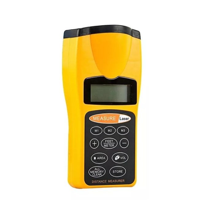 A Trena eletrônica ultra-sônica com mira laser é uma ferramenta perfeita para medir rapidamente a distância, área e volume de um quarto ou ainda trabalhar em construções. Pode medir distâncias em linha reta de 0,50 m a 18 m. Seu medidor de distância transmite ondas ultra-sônicas a um ponto que deseja medir. Depois, ele mede o tempo levado pelas ondas para refletir e, em seguida, calcula e mostra a distância medida no visor LCD com fundo azul.Características: Design compacto único