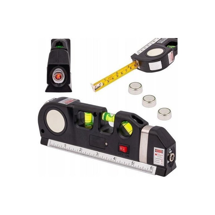 Laser com interruptor, base com régua em alumínio de 6 polegadas e trena de aço de 2,5 metros.