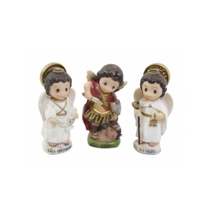 Jogo de enfeite em forma dos três arcanjos (São Gabriel, São Rafael e São Miguel) na versão criança. Detalhes; Material: resina; Peso 0,20 gramas; Altura 8cm; Largura 3cm; Comprimento 4cm.