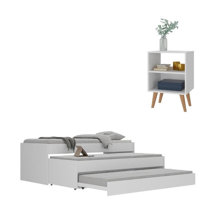 A Tricama Solteiro com Colchão Incluso e Mesa de Cabeceira Retrô Multimóveis MP4183 são produzidas em MDP, garantindo resistência e durabilidade, com acabamento em pintura UV, que proporciona um toque sofisticado ao ambiente. A cama principal suporta até 90kg, enquanto as duas camas auxiliares (possuem rodízios que facilitam a movimentação) suportam até 70kg cada uma. Para oferecer conforto, acompanha colchões D23 com tratamento antiácaro e antialérgico, que proporcionam noites de sono mais tranquilas e saudáveis. E para completar o quarto, acompanha mesa de cabeceira (MDP 12mm) com nichos e pés estilo retrô em polipropileno, que oferecem charme e espaço para organizar os pertences mais utilizados no dia a dia, suportando até 3kg no tampo e 3kg em cada nicho. Este conjunto é perfeito para acomodar visitas ou irmãos que dividem o mesmo quarto com estilo e conforto!