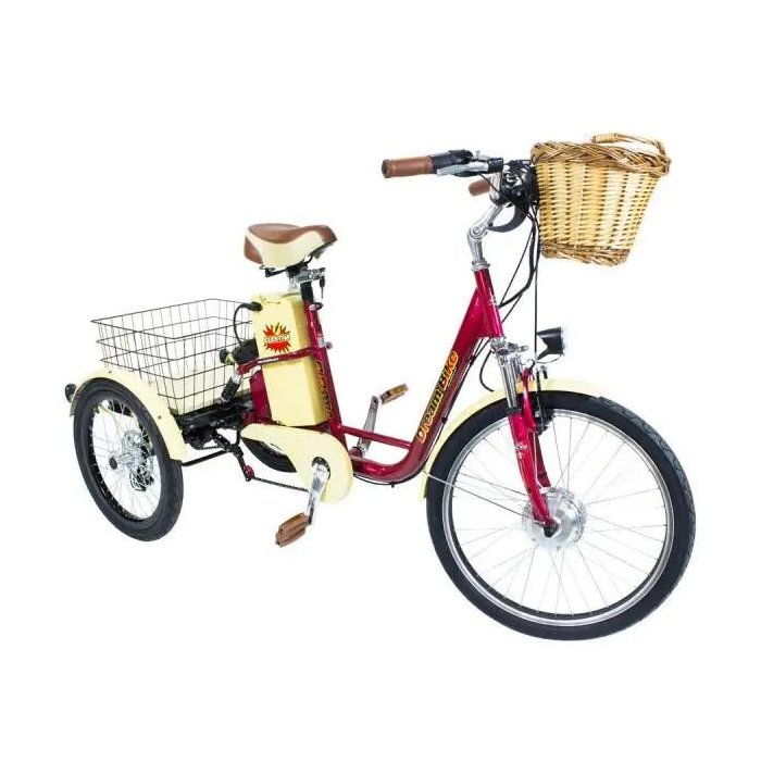 Este modelo é ideal para lazer e utilidades de adultos, idosos, assim como pessoas que tem dificuldades, entre outros, pois não exige equilíbrio e oferece uma boa opção para passeio devido ao conforto ao pedalar em conjunto com a facilidade que a versão elétrica proporciona.Possui quadro especial rebaixado em aço com solda TIG aro 24” na roda dianteira e aro 20” nas rodas traseiras, com pintura eletroestática metálica, aros de alumínio com cubos forjados, eixo com sistema de diferencial traseiro, freios a disco nas rodas traseiras e v-brake na dianteira, manete duplo com função de trava estacionamento, pedivela alumínio com protetor de corrente, garfo dianteiro com suspensão e chassi com suspensão traseira, acabamentos especiais como selim e manopla em couro, além da cesta de vime e para-lamas garantem um acabamento exclusivo e único ao modelo.Sistema elétrico 36 volts, composto por 3 baterias de 12V / 12AH com sistema de pack totalmente removível para carregamento, recarregador Bivolt 110/220, motor de 350 watts no cubo dianteiro com sistema engrenado que multiplica a força e pode ser acionado via acelerador ou em pedal assistido de forma simultânea.Cor disponível – vermelho com detalhes cremeESPECIFICAÇÕES TÉCNICAS TRICICLO ELÉTRICO – ELEKTRATAMANHO RODA DIANTEIRA ARO 24″ AEROTAMANHO RODA TRASEIRA ARO 20″ AEROSISTEMA DE FREIO DUPLO DISCO TRASEIRO e V BRAKE DIANTEIROSISTEMA DE TRAÇÃO TTS DIFERENCIAL TRASEIRO EXCLUSIVOSEM MARCHAS