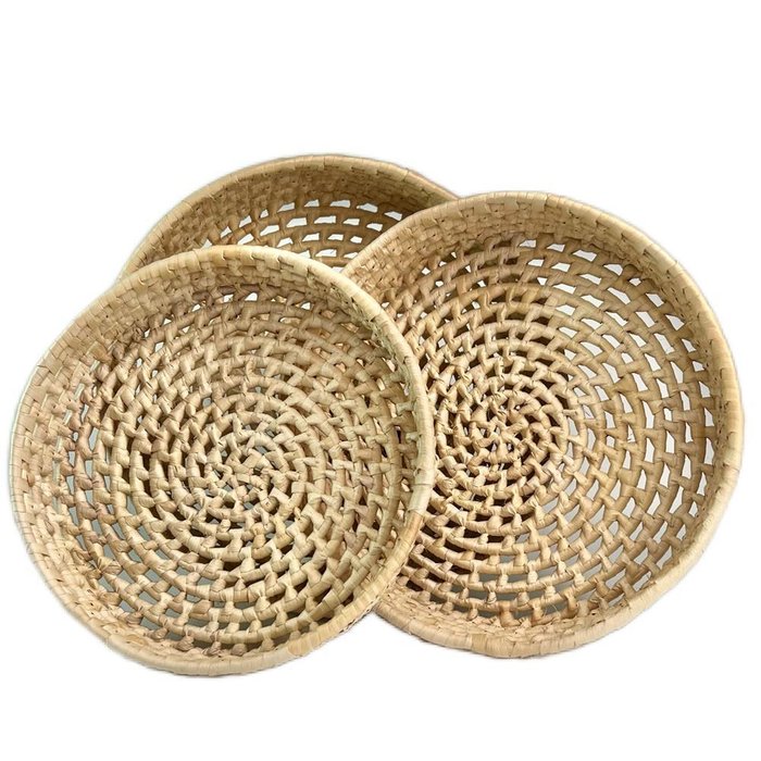 O Trio de Bandejas Redonda da Ana Viégas foram confeccionados manualmente, trazendo todo charme da linha rústica nas peças. Material feito de palha de Carnaúba, árvore nativa da caatinga, produto sustentável e de qualidade! Utilize para oferecer pães, bolos, bolachas, frutas e na decoração de sua casa. Uma ótima opção também para guardar objetos com organização. ESPECIFICAÇÕES TÉCNICAS