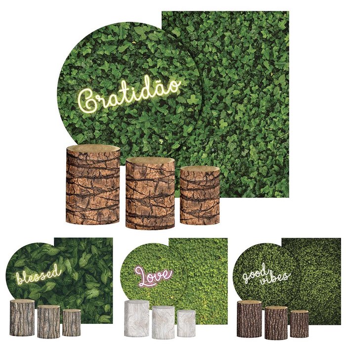 | Itens Inclusos | 1 Painel Redondo em Tecido + 1 Painel Retangular Vertical em Tecido + 3 Capas Cilindro |