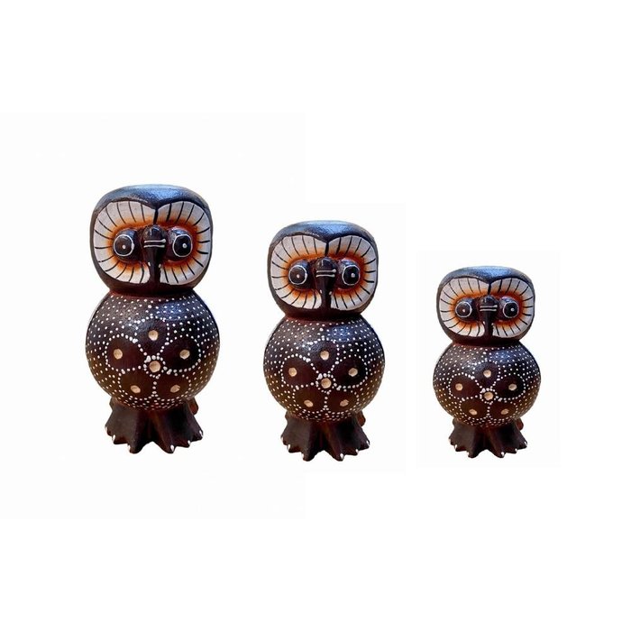 Trio de Corujas Redondas Flor e Bolinhas Brancas Bali 15cm