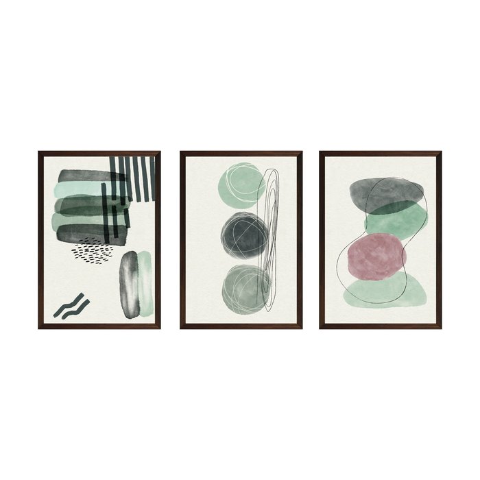 Trio de quadros decorativos com moldura marrom e vidro Abstrato Verde rosa e preto