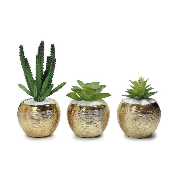Trio de Vasinhos de Cerâmica com Suculentas e Cactos INCLUI: 1 Vasinho em cerâmica dourado com echeveria: 12 x 9,5cm 1 Vasinho em cerâmica dourado com suculenta espetinho: 12,5 x 9,5cm 1 Vasinho em cerâmica dourado com cacto: 19,5 x 9,5cm OBS.: Todos os vasinhos são feitos em cerâmica com textura riscada e pintura dourada brilhante.