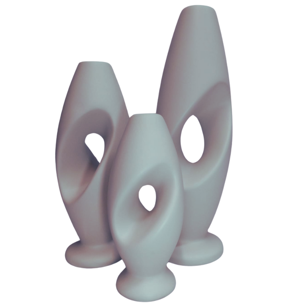Trio de garrafas vazadas em cerâmica, perfeitas para decorar sua casa com estilo e elegância. Feitas à mão, cada peça é única e possui um acabamento impecável.