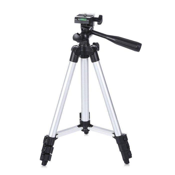 Tripé de Alumínio para Câmera Fotográfica e Celular Universal 1m PrataO tripé para máquinas fotográficas e smartphones foi desenvolvido com hastes em alumínio e pode chegar à altura de até 1,02 metros e suporta equipamentos de até 9 Kg. Ele é equipado com niveladore de bolha para o equipamento fotográfico. Ele ainda conta com cabeça niveladora com rotação de 360° e hastes com inclinação de 85°, que permitem captar imagens próximas ao nível do solo.