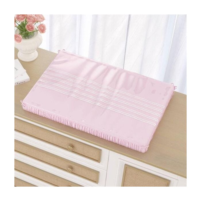 Perfeito para apoiar na cômoda fraldário e completar o espaço da troca de fraldas, esse produto exclusivo é composto por duas peças: um trocador de espuma com capa de tecido bordada e uma capa plástica translúcida com viés rosa.