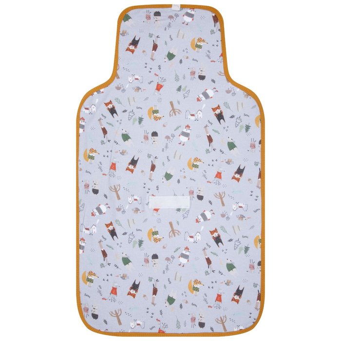 O trocador possui o lado externo em tecido estampado e o outro em pvc. Possui fechamento em fita aderente.