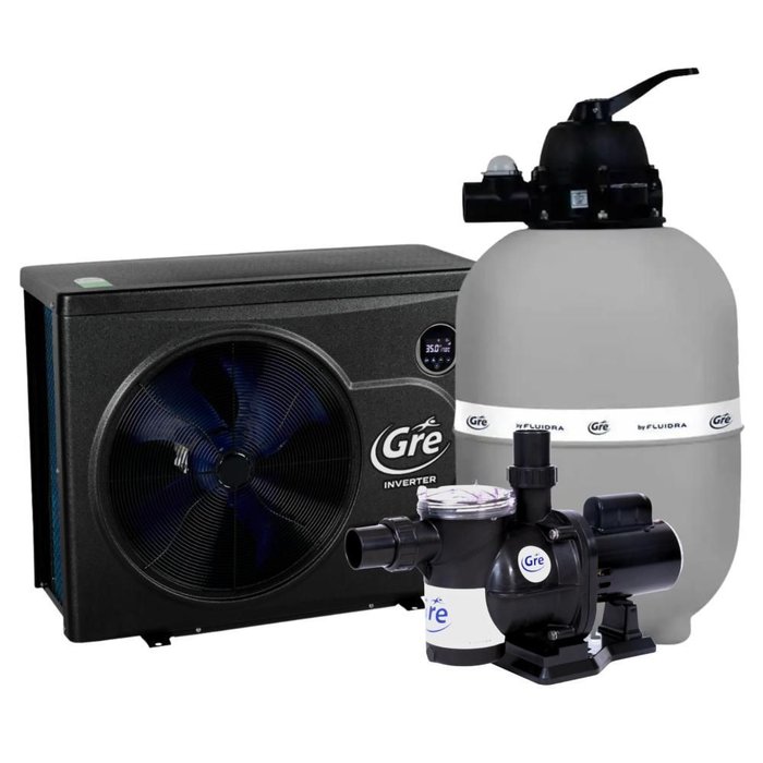 KIT COMPLETO GRE – MOTOBOMBA 1/3CV + FILTRO GRE 300 + BOMBA DE CALOR 10 INVERTERO Kit Completo GRE by Fluidra reúne os três principais equipamentos para quem busca manter a piscina sempre limpa, aquecida e pronta para o uso com máxima eficiência. Este conjunto é composto por:- Motobomba GRE 1/3CV- Filtro GRE 300- Bomba de Calor GRE 10 Inverter Ideal para piscinas residenciais de até 30.000 litros para filtração e até 55.000 litros para aquecimento, este sistema proporciona circulação eficiente, água sempre cristalina e temperatura agradável durante todo o ano, com tecnologia moderna, baixo consumo e instalação simplificada. MOTOBOMBA GRE 1/3CV IP21 110/220V MONOFÁSICAA Motobomba GRE 1/3CV é silenciosa, potente e de alta durabilidade. Ideal para circulação da água em piscinas residenciais, possui motor bivolt (110/220V), proteção IP21 e pré-filtro com tampa transparente. Seu rotor garante desempenho eficiente com baixo consumo energético. CARACTERÍSTICAS PRINCIPAIS:- Potência: 1/3CV- Tensão: Bivolt (110/220V)- Frequência: 60Hz- Grau de proteção: IP21- Pré-filtro com tampa transparente- Motor com protetor térmico- Baixo nível de ruído