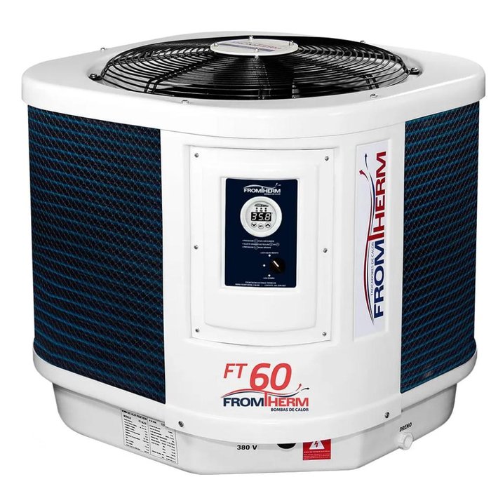 TROCADOR DE CALOR PARA PISCINAS C/ PAINEL - FT60 - FROMTHERMTrocador de calor FT-60 FROMTHERM As Bombas de calor são equipamentos para aquecer a água de piscinas e spas. Utilizam um ciclo de refrigeração para retirar calor de uma fonte quente, no caso o ar do ambiente onde o aparelho estiver instalado, e transferir para uma fonte fria, a água que deseja aquecer chegando a uma temperatura de até 40°C. As bombas de calor da Fromtherm, por meio de um sistema inovador e ecologicamente correto, economizam até 6x mais energia que os sistemas convencionais.CARACTERISTICAS: Única que funciona em temperaturas negativas (até -10°c); Mais silenciosa e compacta, baixíssimo nível de ruido durante o funcionamento, sendo a bomba de calor mais silenciosa do mercado;Condensador em Titânio, proporciona maior resistência e longevidade ao equipamento, com menos manutenção;Gás ecológico, não agride o meio ambiente;Controlador touch-screen e com opcional de quadro de comando deslocado;Instalação mais fácil e design moderno, as bombas foram projetadas para uma fácil e prática instalação, podendo ser abaixo ou acima do nível da piscina;Melhor performance do mercado, maior aquecimento com o menos consumo;Automação da motobomba de série pelo controlador digitalATENÇÃO AO COMPRAR!
