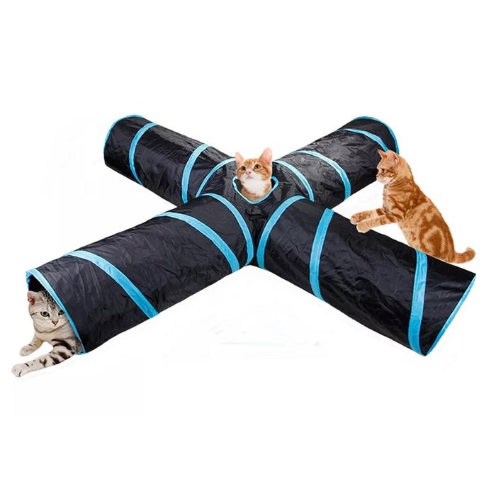 Túnel Para Gatos em X dobrável, com 4 saídas, é o que todo gato gostaria de ter. Ao abrir, é acionado automaticamente, basta retirar as amarras e puxar. Sua estrutura aramada mantém seu formato enquanto estiver em uso.