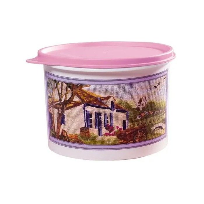 Tupper Caixa 1,7 Litros Linha Telas Tupperware Branco com Decoração bordado em ponto cruz e tampa rosa