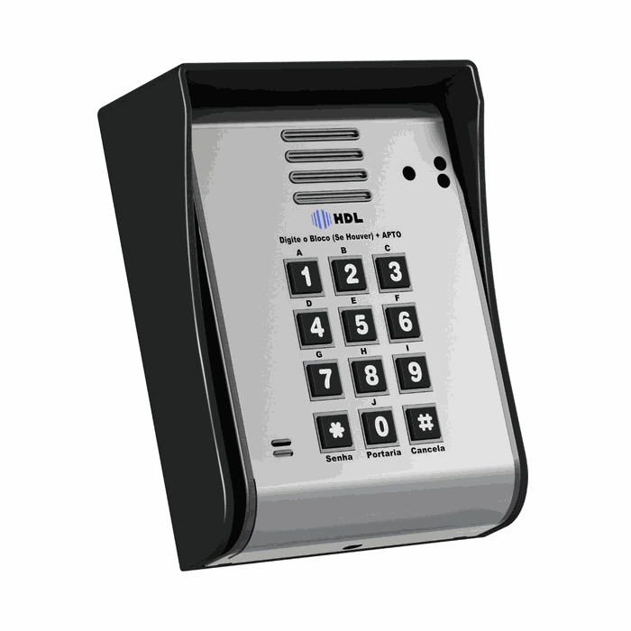 Porteiro eletrônico HDL F-20 Senha, para centrais condominiais, Permite a comunicação com ramais e a abertura de até dois dispositivos externos via ramal atendente, senha numérica, tag ou cartão RFID, ou atuador externo. Possui teclado de silicone, controle de acesso por senha, tag ou app, e fonte interna bivolt. Especificações: - Telefone e Porteiro - Teclado: 12 Teclas, Silicone com backlight - Áudio: Viva Voz (Half Duplex) - Câmera Interna: Não - Alimentação: Fonte 90~240 Vac (não inclusa) - RFID (125Khz): Sim - Saída para fechadura magnética: Sim - Saídas para fechadura: 2 - Entrada de botoeira: Sim - Abertura de Fechadura com Senha: Sim (2 senhas - 4 digitos) - Ajuste Volume: Trimpot - Máximo de Unidades Externas: 40 - Instalação como Ramal: Sim - Distancia Máxima Instalação: 2000mts - Sistema Anti Violação: Não - Fixação: Sobrepor - Material: Plástico ABS e Alumínio - Peso: 0,42 kg - Consumo: 6W - Dimensões da Embalagem: 68x200x250