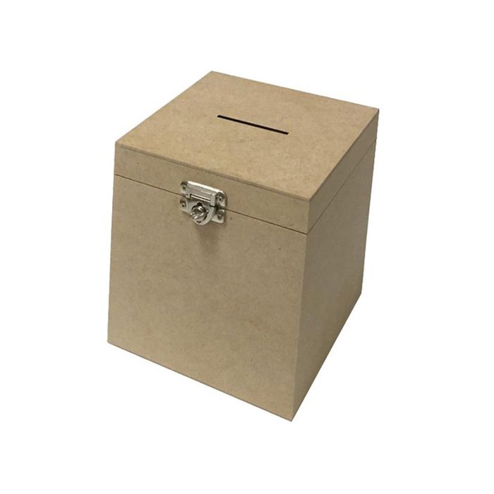 Urna feita artesanalmente em mdf, seu acabamento possibilita vários tipos de personalização. Serve perfeitamente como cofre para cédulas e moedas, caixa de sugestões ou urna de sorteios. Possui dobradiças e fecho que comporta cadeado.