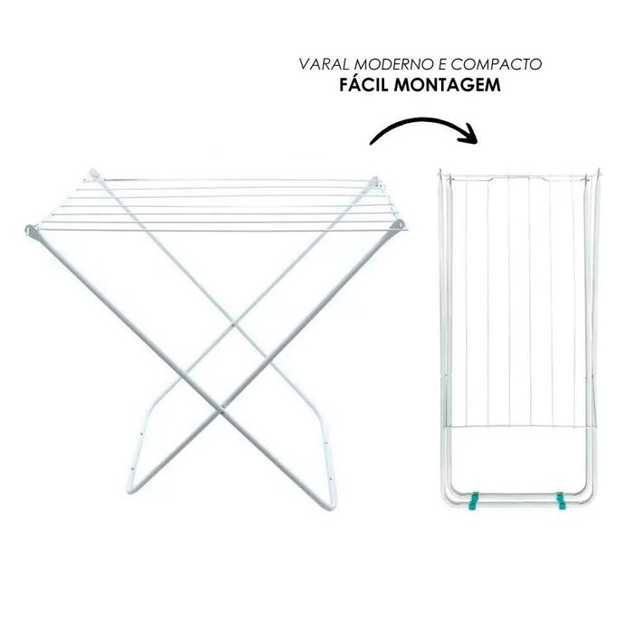Varal de Chão Portátil - Branco Perfeito para quem busca mais praticidade e qualidade sem ocupar muito do espaço da sua casa. O varal tem um design moderno e compacto, de fácil montagem e será uma ótima escolha na hora de estender suas roupas, além de ser retrátil e super prático para guardar, cabendo em qualquer canto da sua casa. Feito de material de qualidade, é resistente e suporta até 10kg sem correr o risco de quebrar. ESPECIFICAÇÕES: Material: Aço Dimensões: Alt.: 80cm x Larg.: 80cm x Profundidade : 50cm Peso: Aprox. 1,8KG Peso Suportada: 8kg Cor: Branco CONTÉM: 01 VARAL DE CHÃO PORTÁTIL - BRANCO