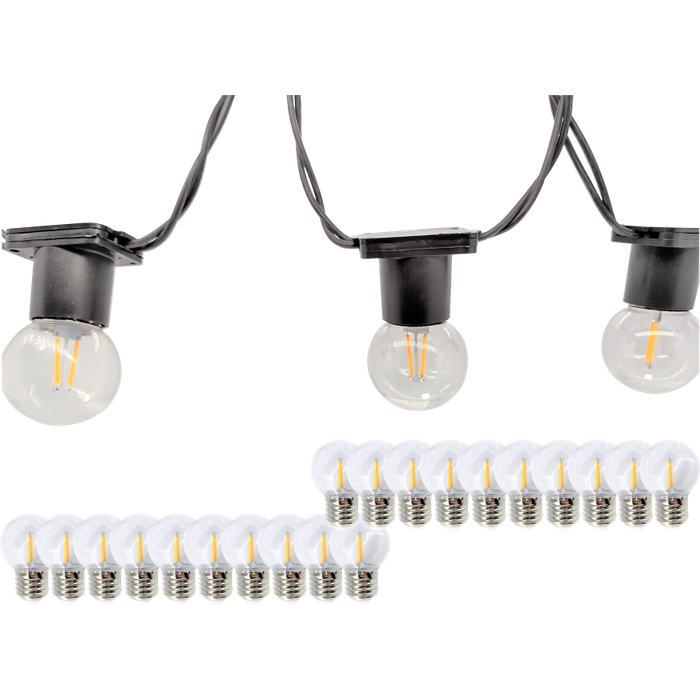 10 metros com 20 soquetes IP65, vedados contra água, para utilização em áreas externas.