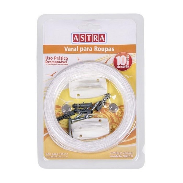 Varal de Parede Regulável 10M AstraDescriçãoO Varal Para Roupas Corda 10 Metros Desmontável da Astra é resistente e foi inspirado no cunho náutico para amarração de barcos, pode ser instalado na vertical e horizontal.Dados AdicionaisCor: BrancoGarantia (mês): 3Produto: Varal com 10 Metros de CordaUso Indicado: Estender para Secar RoupasConteúdo da Embalagem: 1 Corda e Kit de FixaçãoDimensões Aproximadas do Produto com Embalagem (cm) - AxLxP: 22 x 3,6 x 15 cmLinha: LavanderiaMaterial: NylonInformações Adicionais: Permite o Controle de Altura da Corda. A Corda Pode Ser Retirada Após o Uso. Informações e dados são de responsabilidade do fornecedor.Ambiente Indicado: Externo e InternoQuantidade de Peças: 1Referência do Produto no Fornecedor: VRL10Marca: AstraPeso (kg): 0,057Altura (cm): 1Profundidade (cm): 1Largura (cm): 1000Capacidade de Peso: 50 gAcompanha Corda: SimPossui Aba de Varal: NãoQuantidade de Varetas: 1Código de Barras: 7891222228210
