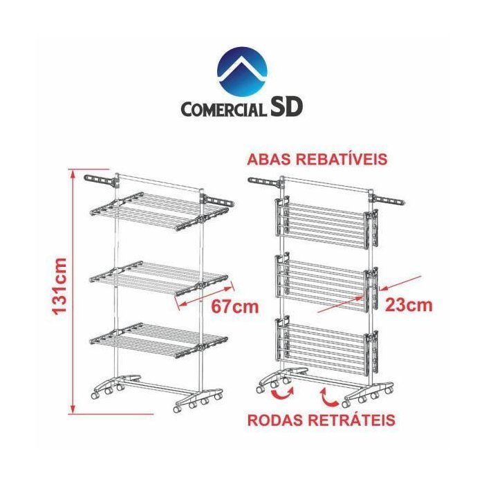 Varal multifuncional com 3 andares de prateleiras retráteis, projetados para otimizar o espaço da sua lavanderia e proporcionar uma melhor secagem de roupas, toalhas, roupas íntimas e calçados. Rodas para fácil manuseio e ótima opção de armazenagem.