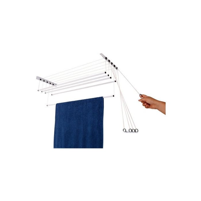 Varal de Teto ou de Parede 150 CMS - Aço Pintado Branco com 5 VaretasVaretas Descem IndividualmenteResiste até 14 KG de Roupas ÚmidasFácil Instalação: Varal Pré MontadoMaterial: 100% AçoAcabamento: Pintura Eletrostática BrancaQuantidade Varetas: 05Garantia: 1 Ano