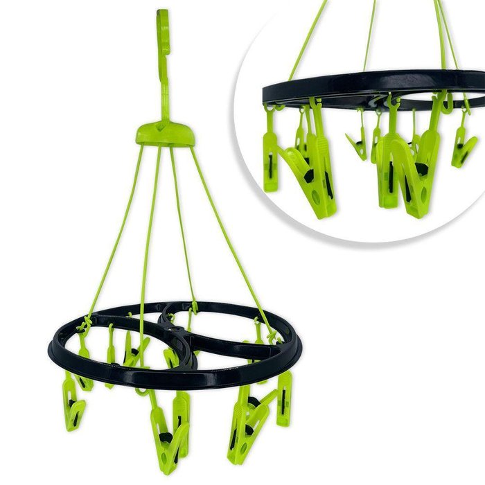 Esse varal multiuso é ideal para quem tem pouco espaço para estender suas roupas, possui 12 prendedores sendo uma solução compacta e versátil para secar suas roupas sem danificá-las. Deixe seu dia a dia mais prático com esse varal, fácil na hora de guardar. Prendedores em material resistente, ideal para pendurar peças delicadas como calcinhas, cuecas, meias e acessórios. ESPECIFICAÇÕES:Material: Plástico e açoDimensões: 28cm comprimento x 28cm larguraCapacidade: 12 PregadoresSuporta até 2kg no totalCor: Preto com Verde CONTÉM:01 Varal Roupas íntimas com 12 Pregadores