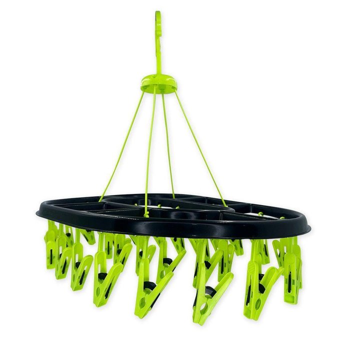 Varal multiuso com 36 prendedores, oferecendo uma solução compacta para secar roupas em espaços pequenos.Ideal para quem busca praticidade no dia a dia, sendo fácil de usar e guardar.Os prendedores são feitos de material resistente, adequado para pendurar peças delicadas como calcinhas, cuecas, meias e acessórios.Especificações:Material: Plástico e aço.Dimensões: Comprimento: 44cm x Largura: 34cm.Capacidade: 36 pregadores.Suporta até 4kg no total.Cor: Preto com Verde.Conteúdo: 01 Varal para roupas íntimas com 36 pregadores.