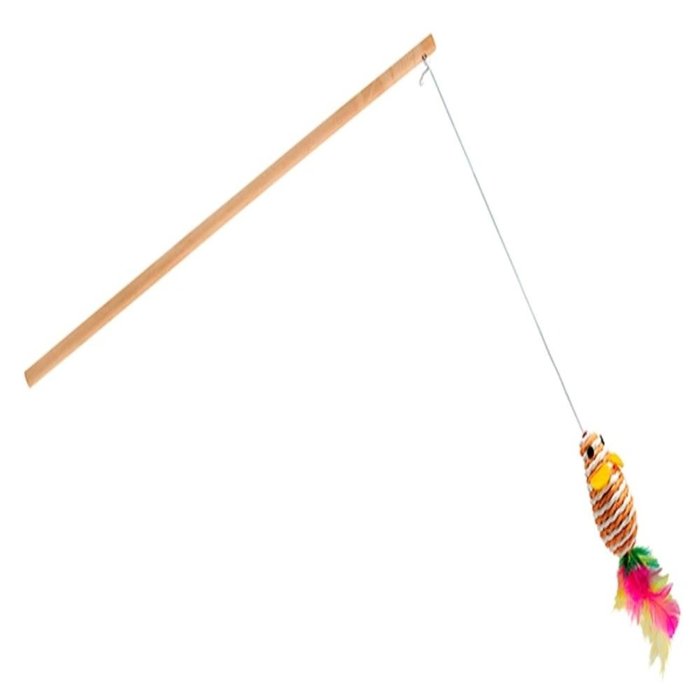 VARETINHA RATO SISAL C/ PENAS (30 CM) - CAT072 UN COM 1 UN Promove a interação e o exercício saudável dos felinos! Material colorido e realiza movimentos atraentes! Material: Varetinha e sisal Altura x Comprimento x Largura: 2 cm x 30 cm x 1 " Com som: Não Modelo: varetinha com rato sisal com penas